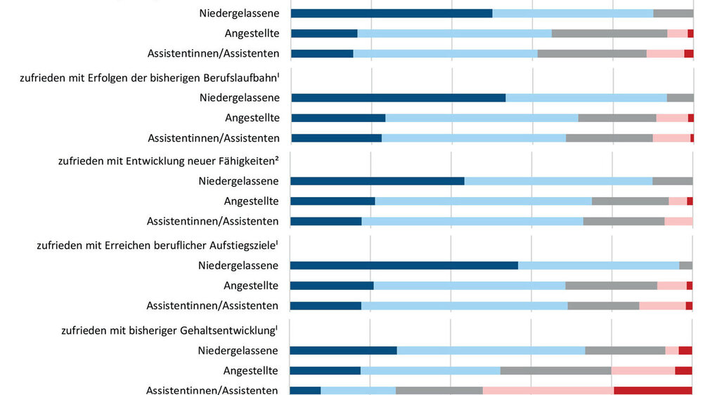 Die Ergebnisse aus der IDZ-Studie zeigen jedenfalls eines deutlich: Die Zufriedenheit nimmt mit jeder beruflichen Statusphase zu (Grafik). Die Unterschiede sind signifikant: Am zufriedensten mit ihren beruflichen Fortschritten sind die etwa vier Jahre nach ihrer Approbation bereits niedergelassenen jungen Zahnärztinnen und Zahnärzte.