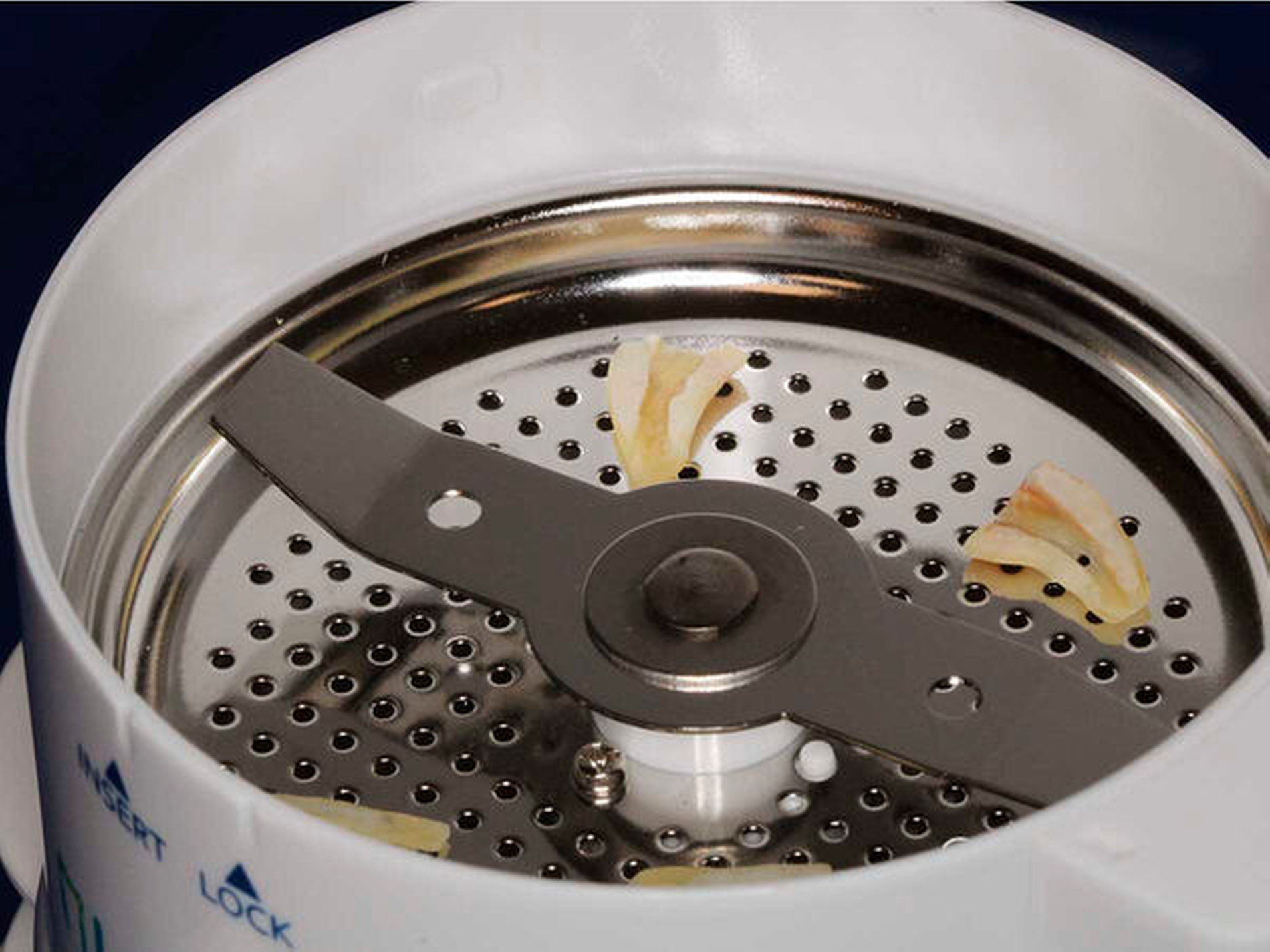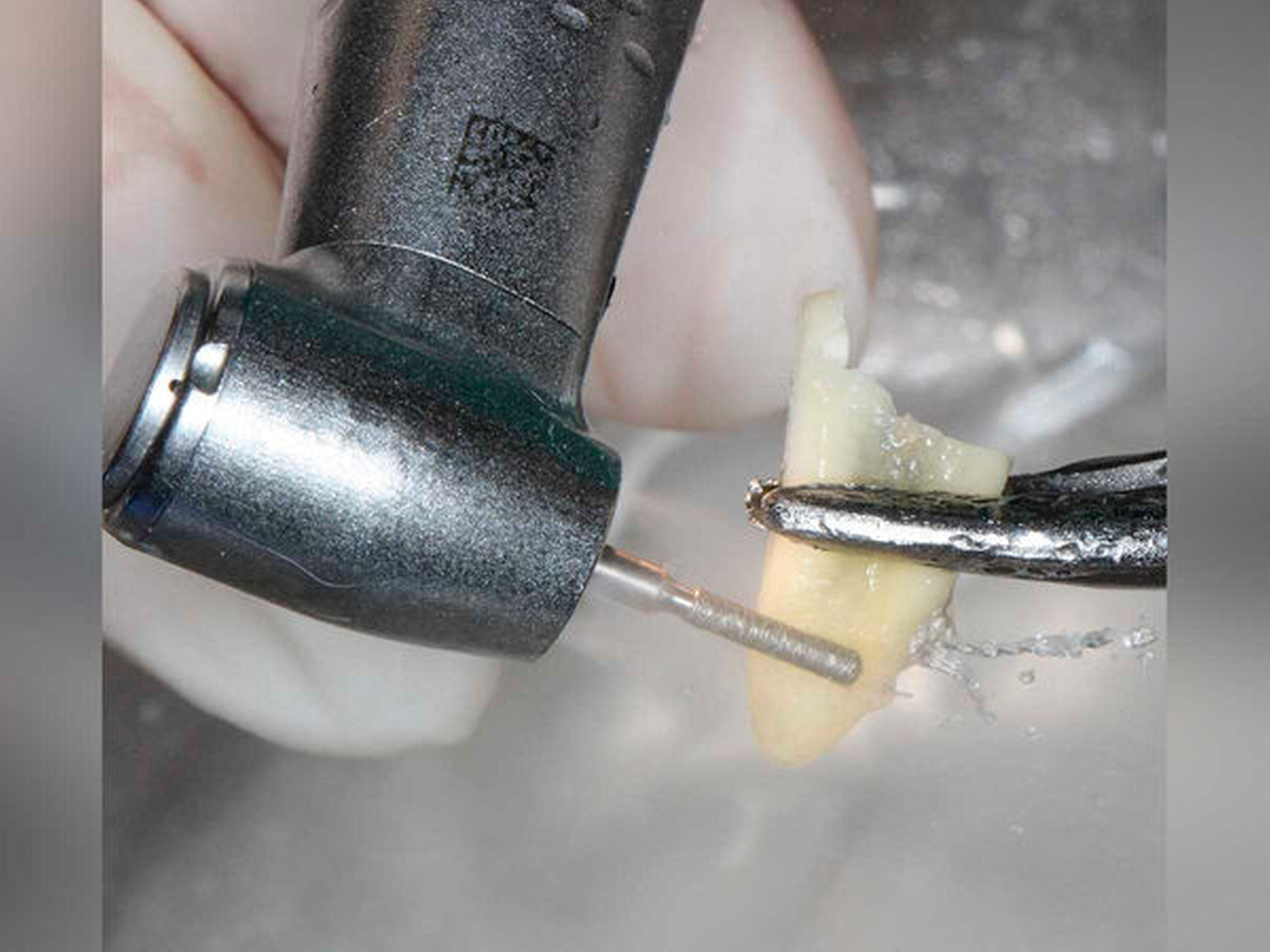 Zahnaufbereitung: Nach der Extraktion des Zahnes 18 folgte die Entfernung von Debris sowie des Parodontalligaments von der Wurzeloberfläche mit einem grobkörnigen Diamantschleifer unter Wasserkühlung (Abbildung 2a). Mittels einer diamantierten Trennscheibe (Frios MicroSaw, Dentsply Sirona Implants, Mannheim, Deutschland) wurde unter Wasserkühlung eine circa 1–1,5 mm starke Dentinscheibe gewonnen (Abbildung 2b). Das restliche Dentin wurde mit einem sterilen Einweg-Mahlwerk (Smart Dentin Grinder, Kometa Bio, Creskill, USA) in 300–1200 μm große Dentinpartikel zerkleinert (Abbildungen 2c und 2d). Die Dentinscheibe und das Partikulat wurden anschließend chemisch mit antibakteriellen Lösungen aufbereitet. Abschließend erfolgte eine partielle Demineralisierung des Dentins zur Freilegung des Kollagennetzwerks und zur Freigabe osteoinduktiv wirksamer Wachstumsfaktoren [Y. K. Kim et al., 2014]. Die Zahnaufbereitung erfolgte simultan zum implantologischen Eingriff regio 22.