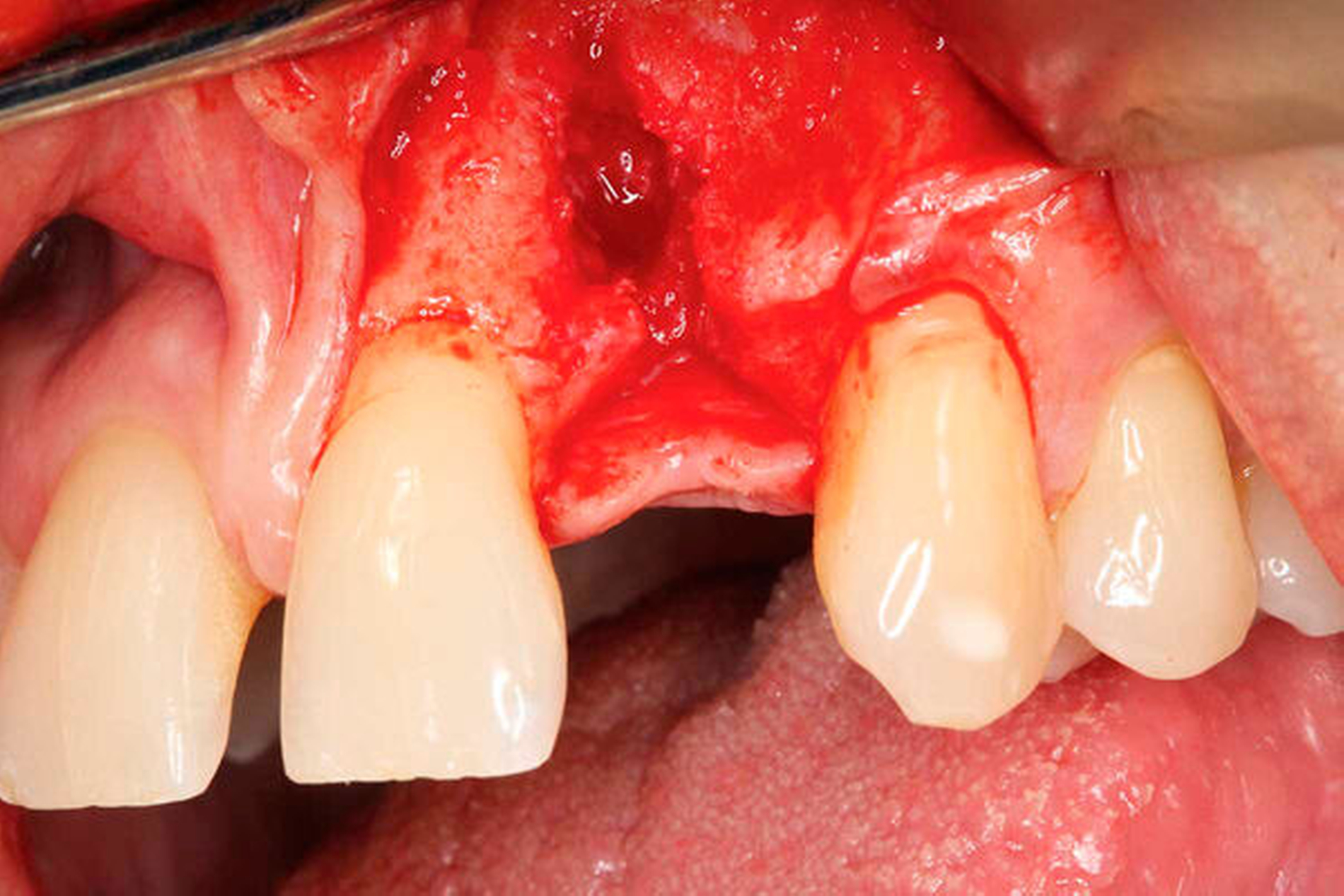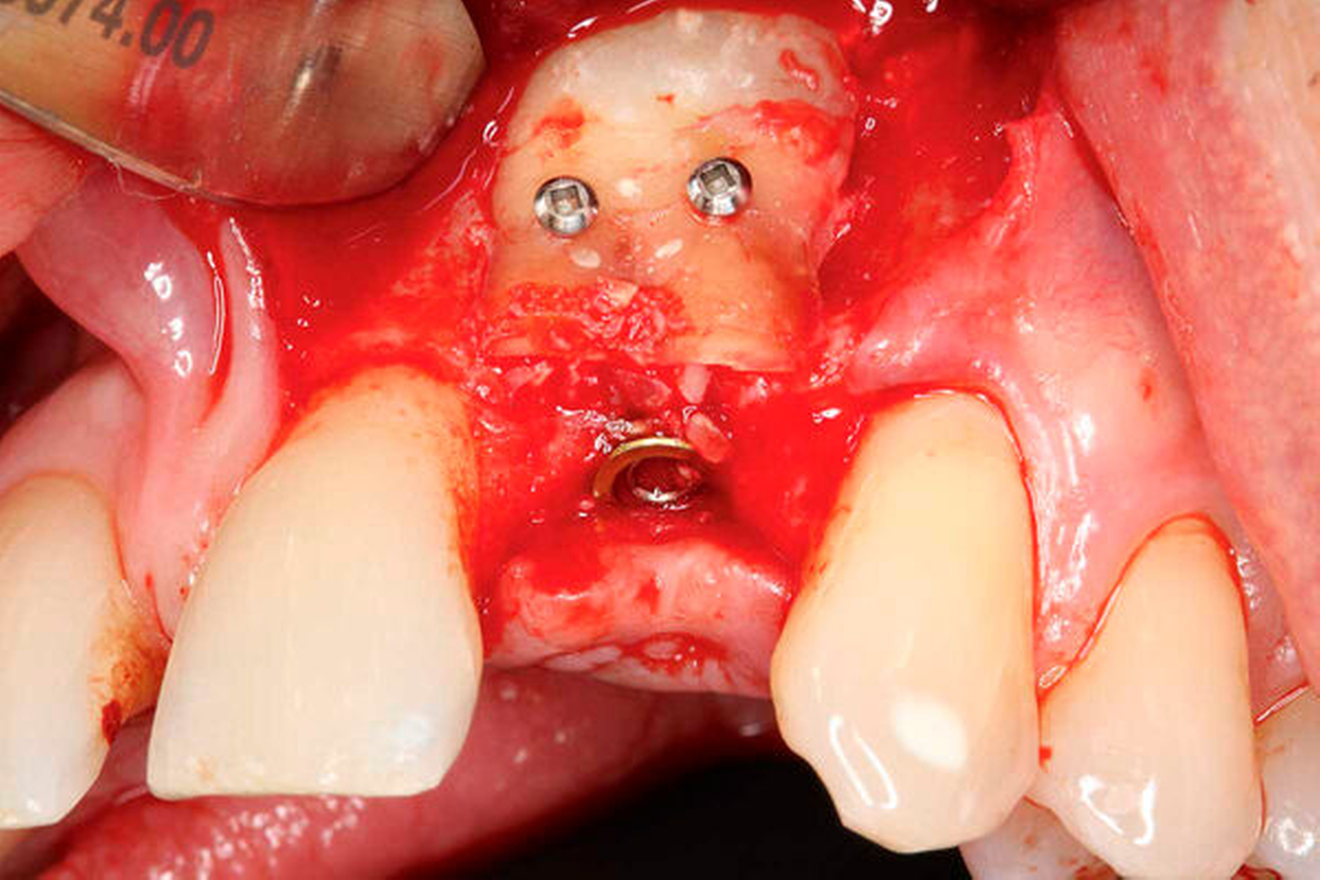 Da regio 11/21 ein Diastema vorlag sowie zuvor Zahn 22 lückig zu Zahn 21 war, kam eine Brückenkonstruktion aufgrund ästhetischer Nachteile für den Patienten nicht infrage. Außerdem sollten ein Beschleifen und der damit einhergehende Hartsubstanzverlust an den Nachbarzähnen vermieden werden. Die bukkale Knochenlamelle war infektionsbedingt weitestgehend resorbiert, wodurch sich die Notwendigkeit einer Augmentation ergab. Da der Patient eine Knochenentnahme nach Möglichkeit vermeiden wollte, sollte ein nicht erhaltungswürdiger und durch die Schleimhaut ragender oberer Weisheitszahn für die Augmentation mit autologem Dentin genutzt werden.