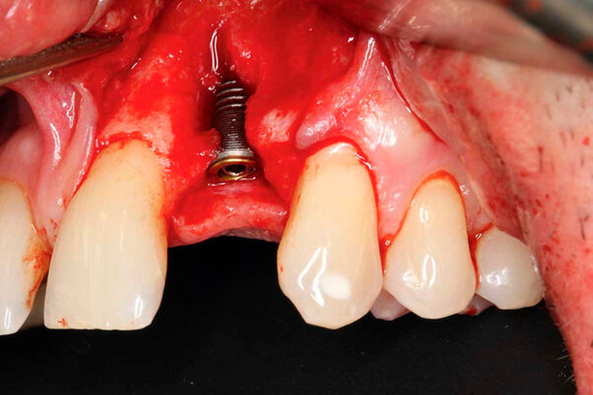 Die Wundheilung in regio 22 verlief komplikationsfrei. Nach drei Monaten wurde das Implantat freigelegt. Im Rahmen dieser Behandlung erfolgte eine periimplantäre Sondierung. Diese zeigte ein stabiles Augmentat ohne erhöhte Sondierung. Die Messung des Implantatstabilitätsquotienten ISQ (Osstell Mentor, Ostell, Göteborg, Schweden) ergab einen Wert von 70. Das Implantat konnte somit für die prothetische Versorgung freigegeben werden.