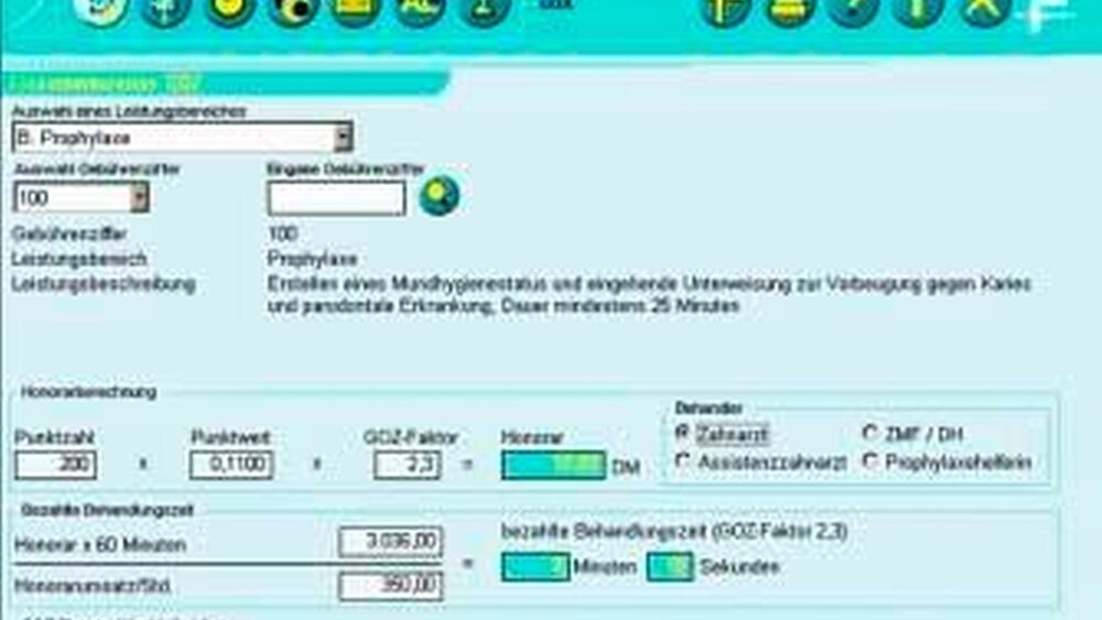 Was macht das Programm nun? Aus den eingegeben praxisspezifischen Umsatzwerten wird eine Kenngröße errechnet. Diese Kenngröße dient dazu, bei festgelegten Honoraren (etwa BEMA) die bezahlte Behandlungszeit und bei variablen Honoraren (GOZ oder GOÄ) den betriebswirtschaftlich erforderlichen Honorarfaktor zu ermitteln. Die Berechnungen sind für den Arzt wie auch den Zahnarzt geeignet.