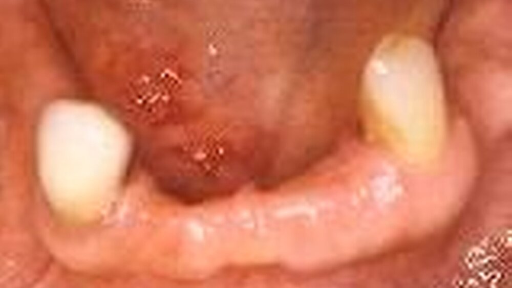 Die meisten Mundhöhlenkarzinome können durch Inspektion diagnostiziert werden [Reibel 2000]. Kleine, symptomarme Plattenepithelkarzinome sind leicht zu übersehen. Aspekte der Früherkennung beinhalten Faktoren, die mit dem Tumor, dessen Größe und Lokalisation, mit dem Patienten sowie mit dem Arzt zu tun haben [Kowalski et al. 1994]. Bekannt ist das Phänomen der verzögerten Diagnose sowohl durch den Patienten als auch durch den Arzt oder Zahnarzt. Es können bis zu sechs Monate vergehen, bis das Mundhöhlenkarzinom endlich zur Behandlung kommt. Die Anwendung der Anfärbung mit Toluidin-Blau (Abb. 1 und 2) bei Risikopatienten wird international immer wieder empfohlen, wird aber von einigen nach wie vor kritisch gesehen [Reibel 2000]. Seit kurzem wird die so genannte „brush biopsy“ (Bürstenbiopsie) intensiv diskutiert, bei der über ein spezielles Computerprogramm Epithelzellatypien festgestellt werden, um damit eine frühe Erkennung einer Malignisierung zu ermöglichen [Sciubba 2002]. Dieses Verfahren ist in Deutschland noch nicht eingeführt; darüber hinaus muss erst eine endgültige Beurteilung des Verfahrens erfolgen. Von besonderer Bedeutung ist, dass die meisten Mundhöhlenkarzinome aus klinisch gesunder Mundschleimhaut entstehen. Zwischen elf und 67 Prozent aller Mundhöhlenkarzinome entwickeln sich aus oralen Leukoplakien [Scheifele & Reichart 1998]. Das klinische Bild des Mundhöhlenkarzinoms ist variabel. Meist findet sich ein exulzerierter Tumor vor allem im Mundboden und am lateralen Zungenrand (Abb 3 und 4). Klinische Symptome sind Schmerzen, Blutungen, Lockerung von Zähnen, Funktionseinschränkungen sowie Parästhesien und Anästhesien und Foetor ex ore. Dazu kommt die typische Tabakund oft auch Alkoholanamnese. In seltenen Fällen entsteht das Plattenepithelkarzinom auf dem Boden eines Lichen planus (Abb. 4). Neben dem oralen Befund ist der Zustand der regionalen Lymphknoten palpatorisch beziehungsweise sonografisch zu ermitteln. Wesentlich seltener als das Plattenepithelkarzinom der Mundhöhle werden verruköse Karzinome diagnostiziert (Abb. 5). Hier finden sich verrukös- papilläre Strukturen, häufig im Bereich des Mundbodens oder der Wangenschleimhaut.