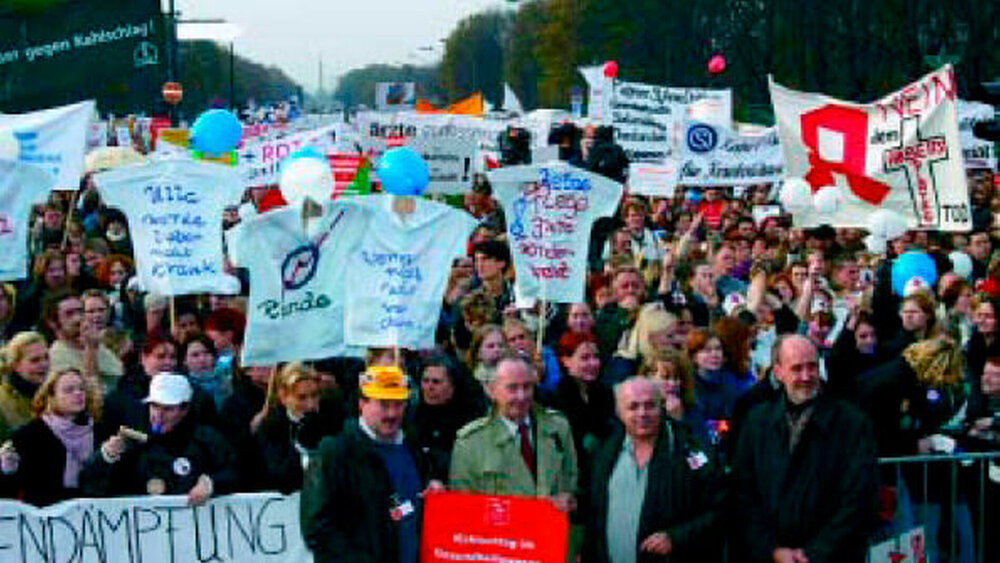 „Die Panikmache zur Durchsetzung separater Interessen ist unverantwortlich,“ polemisierte die für Gesundheit zuständige Bundesministerin anlässlich der vom Bündnis Gesundheit 2000 – es vertritt 38 Organisationen der Heilberufe – und der Deutschen Krankenhausgesellschaft organisierten Großdemonstration. Immerhin war diese „Panikmache“ eine drei Seiten starke rechtfertigende Pressemitteilung des Bundesministeriums für Gesundheit und Soziale Sicherung (BMG) wert. Ministerin Schmidt hatte den Ernst der Lage erkannt und drohte, „die Selbstverwaltung zur Disposition zu stellen, wenn keine Bereitschaft mehr besteht, die Aufgaben wahrzunehmen“. Davon war allerdings auf der Kundgebung nicht die Rede.