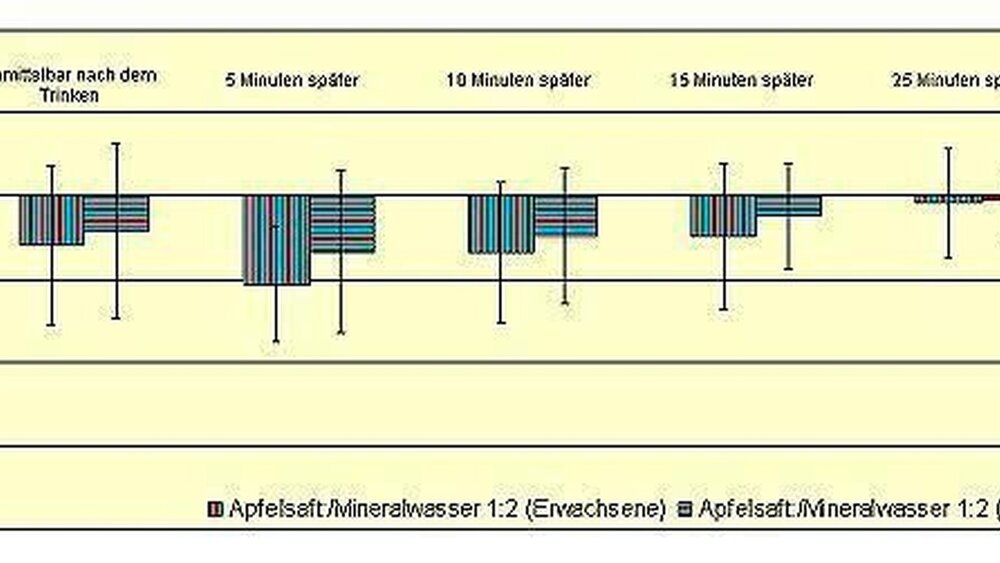 In der vorliegenden Studie sollten mögliche Unterschiede des pH-Wertes des Gesamtspeichels nach Genuss verschiedener Getränke bei Kindern und Erwachsenen überprüft werden. Von besonderer Bedeutung war, ob Fruchtsaftverdünnungen unterschiedlicher Konzentrationen weniger erosive Parameter aufweisen als unverdünnte Fruchtsäfte.