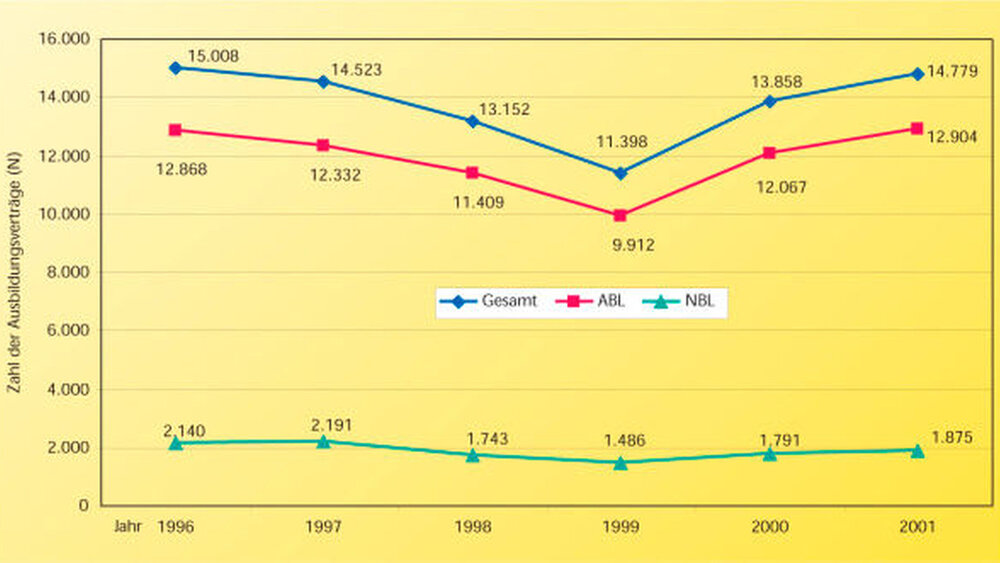 Nach der im Jahr 2000 einsetzenden Trendwende setzte sich erfreulicherweise die Zunahme von neu abgeschlossenen Ausbildungsverträgen für ZFA auch in 2001 fort. Die Ab- und Zunahme der Zahlen für Neuabschlüsse schlägt sich statistisch in den alten Bundesländern (ABL) deutlicher nieder als in den neuen Bundesländern (NBL) (NBL einschließlich Berlin). Letztere zeigen im Trend stabilere Werte, allerdings auf einem niedrigeren Niveau (siehe Abbildung 1).