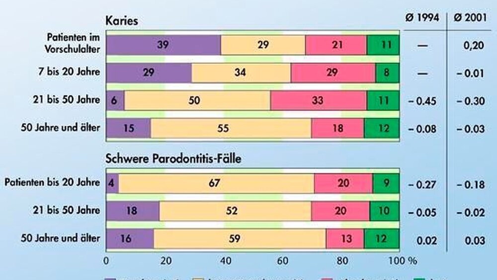 Was die schweren Parodontitis-Fälle anbelangt, so stellt die Mehrheit der Zahnärzte fest, dass sich in den letzten Jahren nicht viel verändert hat. Nur bei den bis 20-jährigen Patienten ist der Anteil der Zahnärzte, die eine Abnahme feststellen (20 Prozent) deutlich höher als derjenige, die eine Zunahme rapportieren (vier Prozent). Im Vergleich zu 1994 hat sich dieses Resultat trotzdem leicht verschlechtert (1994: Abnahme: 30 Prozent).