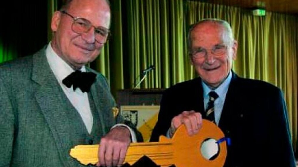Nicht nur in der Universitätszahnklinik war es so, dass Prof. Dr. Dr. Franz Härle die Leitung der kieferchirurgischen Abteilung von Prof. Hahn übernahm, sondern nun, genau zwanzig Jahre später, soll es auch das Heinrich- Hammer-Institut sein, dessen Leitung an Härle übergeht. „Mit 90 muss ich nun endlich mal Schluss machen, solche Ämter zu bekleiden“, meint der Jubilar mit dem bei ihm so bekannten Schmunzeln. Symbolisch für die Übergabe der Amtsgeschäfte – die er ja sowieso immer noch hier oder da beratend übernehmen wird – reichte er seinem Nachfolger einen überdimensionalen Holzschlüssel. Professor Härle ist ziemlich zuversichtlich, dass er ein genauso wohlgeordnetes Institut übernehmen wird, wie er damals eine perfekt organisierte Abteilung übernehmen durfte, als er in Hahns Fußstapfen trat.