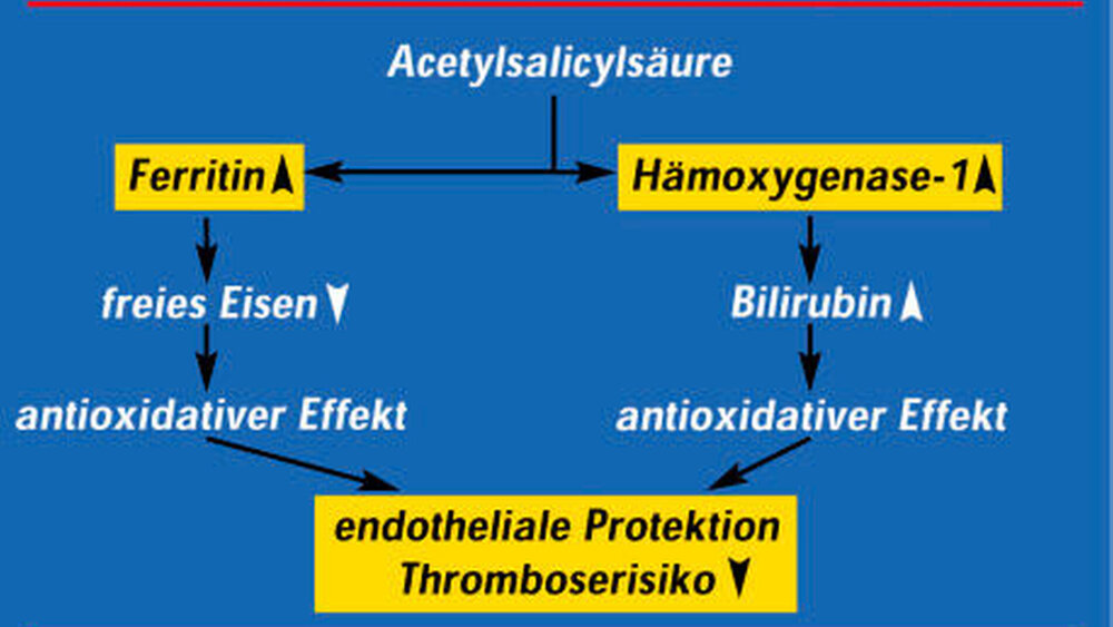 Wie Prof. Henning Schröder von der Universität Halle-Wittenberg auseinander setzte, ist ASS nicht nur als Hemmstoff der Prostaglandine schmerzlindernd, aggregationshemmend und antientzündlich aktiv, sondern auch gefäßprotektiv, indem es gleich über zwei voneinander unabhängige Mechanismen und in der üblichen Dosis antioxidativ wirkt. Dieser Effekt kommt einerseits durch die Förderung der Ferritinsynthese zustande, wodurch das Angebot an freiem Eisen vermindert wird. Andererseits wird durch Stimulation der Hämoxigenase-1 das Bilirubinangebot verstärkt. Bilirubin ist inzwischen als weiteres antioxidatives Agens entschlüsselt worden. Es ist also nicht nur ein störendes Abbauprodukt des roten Blutfarbstoffes.