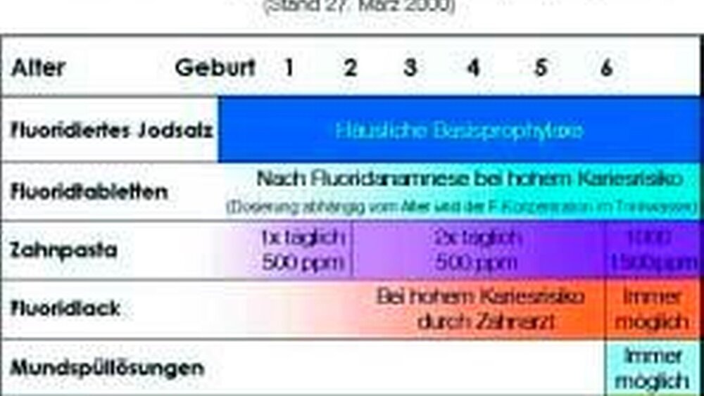 Aktuelle Fragen zu zwei der bedeutendsten Kariespräventiva, den Fluoriden und dem Chlorhexidin, standen auf der Tagesordnung. Da seit mehreren Jahren die Wertigkeit der systemischen und lokalen Fluoridapplikation zwischen den kinderzahnärztlichen und pädiatrischen Fachgesellschaften kontrovers diskutiert wird, rückte diese Thematik in den Mittelpunkt des Interesses. Von den pädiatrischen Gesellschaften wird durch die praktizierte Kopplung mit der Vitamin-D-Rachitisprophylaxe nach wie vor die systemische Fluoridtablettengabe in den ersten Lebensjahren favorisiert. Demgegenüber passte die Deutsche Gesellschaft für Zahn-, Mund- und Kieferheilkunde (DGZMK), dem hohen Evidenzniveau des nationalen und internationalen Schrifttums folgend, ihre Fluoridanwendungsempfehlung dem beobachteten Fluorosesrisiko an und favorisiert die Verwendung einer fluoridhaltigen Kinderzahnpaste mit 500 ppm Fluorid ab dem Durchbruch des ersten Milchzahnes (siehe Tabelle). Die Anwendung von Fluoridtabletten sollte nach Ansicht der DGZMK nach einer ausführlichen Fluoridanamnese auf Patienten mit einem hohen Kariesrisiko begrenzt werden.