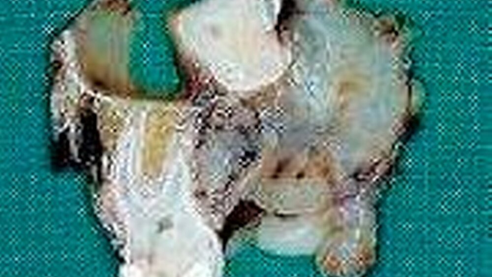 Eine 29-jährige Patientin klagte seit vier Monaten über rezidivierende Schwellungen im Bereich des linken Tuber maxillae. Im Röntgenbild zeigte sich eine Osteolyse apikal und distal des Zahnes 27 (Abb. 1). Der Zahn 27 war nicht sensibel und deutlich gelockert. Der Zahn 28 war retiniert und im Vergleich zur Gegenseite nach cranial verlagert (Abb. 2). Bei der Extraktion des Zahnes 27 fiel dem Behandler auf, dass die knöcherne Alveole des Zahnes durch ein ungewöhnliches und derbes Gewebe ersetzt war, welches zur Auftreibung des Alveolarfortsatzes in diesem Bereich geführt hatte (Abb. 3). Statt der geplanten Osteotomie des Zahnes 28 wurde eine Probeexzision aus dem alveolären Gewebe in regio 27 durchgeführt und die Patientin zur Weiterbehandlung in unsere Klinik überwiesen. Die histologische Untersuchung des Gewebes zeigte das typische Bild eines Chondrosarkoms mit Knorpelstrukturen, ausgeprägten Kerngrößenschwankungen und zahlreichen Mitosen (Abb. 4). Diese Diagnose führte zur radikalen Resektion des Tumors unter Mitnahme des benachbarten Zahnes 26, des Kieferhöhlenbodens und des retinierten Zahnes 28 (Abb. 5 und 6).