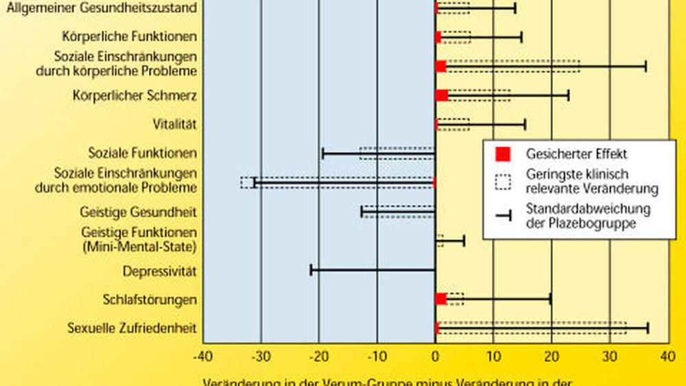 Abb. 1 zeigt nun graphisch die Ergebnisse der Studie nach einem Jahr. Legt man die von den Autoren gezogenen Grenzwerte für die klinische Relevanz von statistisch signifikanten Differenzen zugrunde, so hatte die HRT-Therapie keinen Effekt auf den allgemeinen Gesundheitszustand, die Vitalität, geistige Gesundheit, auf depressive Symptome oder sexuelle Zufriedenheit. Einen statistisch zu sichernden Nutzen, der aber unterhalb der Stufe für eine klinische Relevanz war, fand sich für Schlafstörungen, körperliche Leistungsfähigkeit und Schmerzen. Auch diese Vorteile waren in der wesentlich kleineren Gruppe, die über fünf Jahre verfolgt werden konnte, nicht mehr zu sichern.