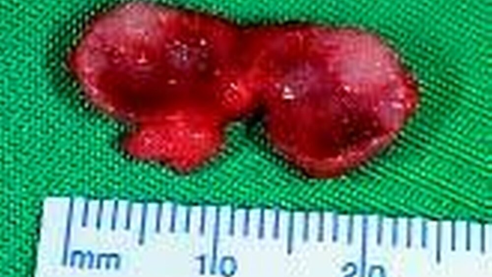 Therapeutisch wurde zunächst eine antibiotische Therapie ex juvandibus eingeleitet und nach fehlender klinischer und sonographischer Rückbildung die diagnostische Entfernung des Befundes in ITN vorgenommen. Auf der Schnittfläche des größten Lymphknotens zeigten sich eine unregelmäßige fokal noduläre Binnenstruktur (Abbildung 4). Histologisch ergab sich der Befund einer unspezifischen Lymphadenitis mit fokaler Abszedierung.