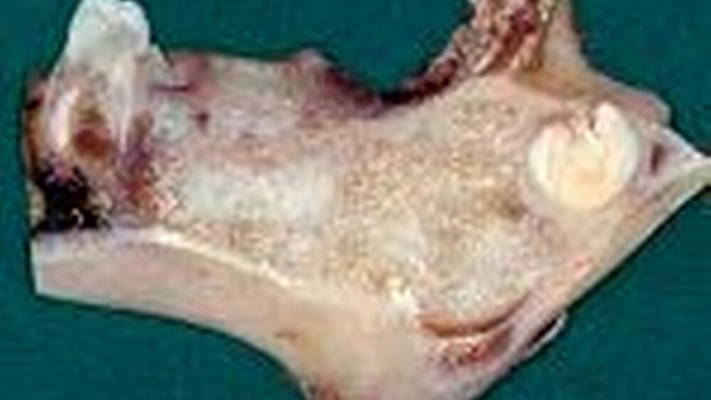 Während der enorale Aspekt unauffällig war, zeigte sich im Röntgenbild nun eine Seifenblasenstruktur des Unterkiefers von regio 36 bis zur Basis des Muskelfortsatzes in unmittelbarer Nachbarschaft zu einem verlagerten Weisheitszahn 38 (Abbildungen 1 und 2). Die Probeexzision aus dem veränderten Knochen ergab die Diagnose eines Myxoms. Dieses wurde im Sinne einer Unterkieferteilresektion unter Mitnahme des verlagerten Weisheitszahnes entfernt (Abbildungen 3 und 4).