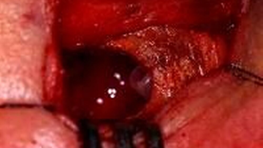 Die definitive Therapie erfolgte über einen subziliaren Zugang. Abbildung 3 a zeigt die Vorwölbung des Befundes nach infraorbital mit weitgehender Auflösung der caudalen knöchernen Orbitabegrenzungen, Abbildung 3b den Situs nach Ausräumen der Occlusionszyste. In der Resthöhle ist jetzt die nach enoral ableitende Drainage erkennbar. Die Periorbita und eine caudale fibröse Narbenzone waren jeweils als Schichten erhalten geblieben. Die Rekonstruktion des Orbitabodens erfolgte daher mit einer PDSSchale, die auf einen medialen und lateralen Knochenanteil aufgelagert werden konnte. Da der Patient ausbestrahlt war, wurde auf eine Spongiosaplastik zur Okklusion des Lumens verzichtet und eine sekundäre Auffüllung durch Granulationsgewebe unter Erhalt der enoralen Drainage abgewartet.
