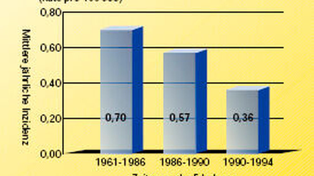 Der Erfolg dieser Präventivmaßnahme war bereits Anfang der 90er Jahre ablesbar, als ein Vergleich der Hepatomhäufigkeit bei der Gruppe der sechs- bis 14-jährigen Kinder möglich wurde und sich eine Halbierung der Häufigkeit belegen ließ (Abb. 3). Dies ist in der Tat der erste nachgewiesene Beitrag von Impfaktionen in der onkologischen Prävention.