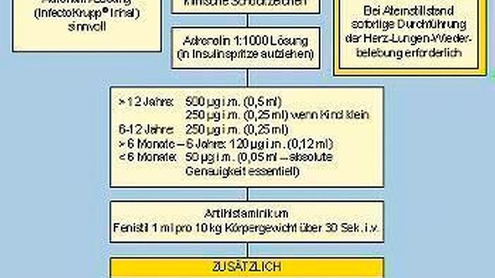 Die aktuellen Empfehlungen internationaler Fachgesellschaften beinhalten für Erwachsene und Kinder gültige Schemata. Übereinstimmend wird eine intravenöse Gabe von Adrenalin in der Verdünnung 1 : 10 000 bei schweren, lebensbedrohlichen Verläufen einer Anaphylaxie mit vorhandenem venösen Zugang empfohlen. Ist die Applikation über einen venösen Zugang nicht möglich, sollte die intramuskuläre Applikation von Adrenalin 1 : 1 000 erfolgen. Die in den meisten Lehrbüchern ausschließlich für die Anwendung bei Erwachsenen empfohlenen Dosierungen sind für die Anwendung bei Kindern ergänzt worden, wobei auch die jüngste Altersgruppe miteinbezogen wurde.