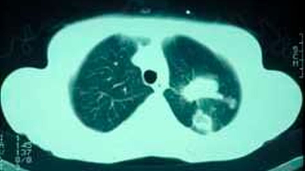 Die histologische Untersuchung der Gewebeprobe zeigte maligne, anaplastische, zytoplasmaarme Zellen mit ausgeprägter Kernpolymorphie und Hyperchromatismus (Abb. 5). Das im Rahmen der anschließenden Primärtumorsuche durchgeführte Computertomogramm des Thorax führte schließlich zur Entdeckung eines zentralen, kleinzelligen Bronchialkarzinoms im Bereich der linken Lunge (Abb. 6). Wenige Monate später verstarb die Patientin an ihrem Tumorleiden.