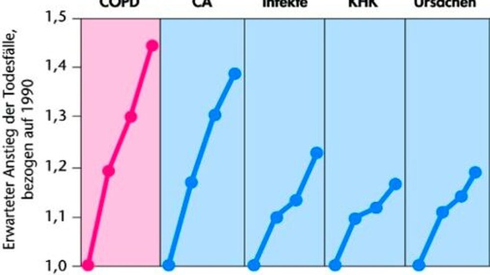 Die meisten Menschen, die durch Abbau der respirativen Kompetenz unter Atemnot leiden, haben in ihrem Leben jahrelang Zigaretten geraucht. Das zeigt Abbildung 1 deutlich: Stoppen Raucher erst beim Eintritt ihrer Beschwerden ihr Laster, ist der Verfall ihrer Lungenfunktion trotzdem kaum noch aufzuhalten. Angesichts des Heeres jugendlicher Raucher in Ländern wie Deutschland wundert es denn auch nicht, wenn die COPD schon im Jahre 2000 eine höhere Mortalitätsrate hatte als das Bronchialkarzinom und die übrigen führenden Todesursachen. Diese Last wird in den Jahren bis 2020 noch drückender (Abbildung 2).