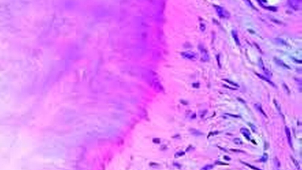 Das (Zemento-)Ossifizierende Fibrom wird heute überwiegend als eine echte Neoplasie betrachtet [Sciubba et al., 2001], daher wird diese Entität von der WHO unter den „Osteogenen Neoplasien“ geführt [Reichart and Philippsen, 2003]. Eine Untergruppe dieser Neoplasien, häufig im Bereich der Nasennebenhöhlen, zeichnet sich durch eine erhöhte Wachstumstendenz aus und wird deshalb als „aggressives“, „juveniles“ oder aktives (Zemento-)Ossifizierendes Fibrom klassifiziert [Zupi et al 2000]. Die Abbildung 5 zeigt das gemeinsame Vorkommen zellhaltiger Hartgewebsanteile, die im weitesten Sinne Knochenbälkchen ähneln (a), neben ausgedehnten basophilen azellulären Mineralisationszonen (b), die morphologisch dem Zahnzement entsprechen. Trotz der teilweise verblüffenden morphologischen Analogie zum Zahnzement, die teilweise noch durch eine den Sharpey’schen Fasern entsprechende Einfassung der Hartgewebsbezirke unterstrichen erscheint (Abb. 6), wird das (Zemento-) Ossifizierende Fibrom mehrheitlich nicht als odontogener Tumor aufgefasst [MacDonald-Jankowski, 2004; Neville et al., 2002]. Tatsächlich fanden sich zementartige Hartgewebsanteile nämlich auch in Tumoren gänzlich außerhalb der Kieferregion, so dass diese Mineralisationsareale letztlich nur einer rarefizierten Knochenvariante entsprechen.