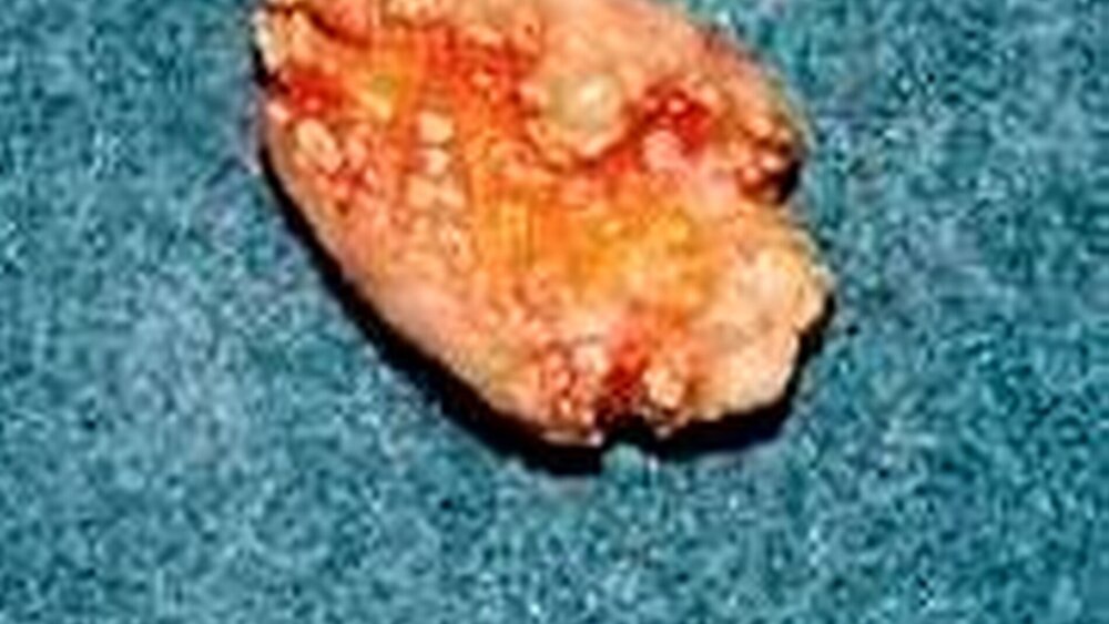 Therapeutisch erfolgte wegen der Nähe zur Papilla parotidea eine Speichelgangrevision von enoral mit Schlitzung des Ausführungsganges, wobei das Konkrement in toto geborgen wurde (Abb. 5). Nach Ausnähung des Gangepithels erfolgte eine Drainage und Gangschienung durch einen Katheter für insgesamt drei Wochen. Die entzündliche Symptomatik bildete sich innerhalb weniger Tage zurück.