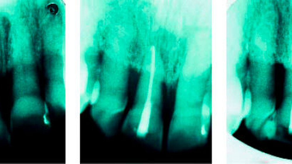 Im folgenden Fall kam Patient A Jahrgang 1924 nach Jahren der Einschleifmaßnahmen und wiederholter Kürzungen der Schneidekante des elongierten Zahnes 11 am 18. Dezember 1997 mit einem Taschenabszess in die Praxis. Zahn 11 wies Lockerungsgrad III auf, mit elf Millimetern Taschentiefe labial und zehn Millimetern mesial und distal. Der horizontale und vertikale Knochenverlust ist auf Aufnahme 1 zu erkennen. Da die Nachbarzähne klinisch nur Lockerungsgrad I aufwiesen und karies- und füllungsfrei waren, sollte ein Totalverlust des Zahnes auch wegen oben angesprochener Folgeproblematik vermieden werden. Bei der folgenden Vitalexstirpation und Kanalaufbereitung kam es zu einem Spontanausfall des Zahnes, so dass die weitere Wurzelkanalbehandlung und -füllung extraoral erfolgen mussten.
