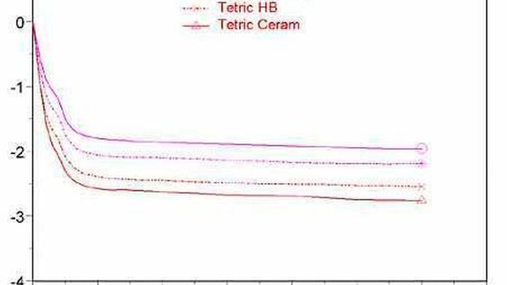 Diesen Befund zeigt die Abb. 1 am Beispiel von Tetric Ceram, das schon früher untersucht wurde. Es sollen damit hier nur die unterschiedlichen Verläufe wie Steigungen demonstriert werden. Die verschiedenen Niveaus, die erreicht werden, lassen sich vermutlich durch die unterschiedlichen Chargen erklären, denn es liegen ein bis drei Jahre zwischen den einzelnen Messungen. Die Kurve in Silikonöl veranschaulicht im übrigen auch den Einfluss der thermischen Ausdehnung auf das Volumenverhalten. Die geringere Wärmeleitung des Öls führt zu einer stärkeren Erwärmung der Probe und damit zu einer größeren Ausdehnung, die der Schrumpfung entgegenwirkt und den Verlauf im Anfangsbereich abflacht.