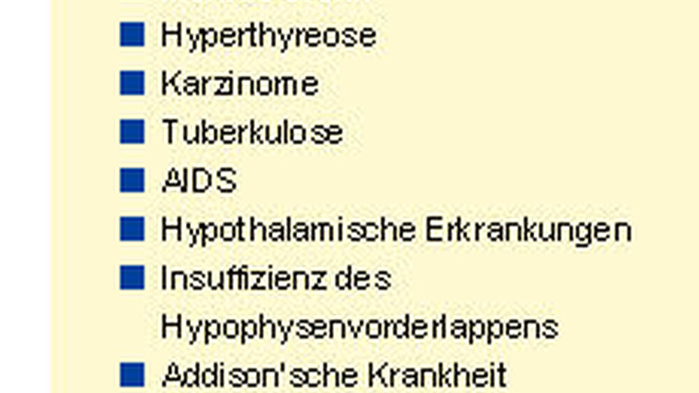 Die Essstörungen sind psychosomatische Erkrankungen, die schwere bis lebensgefährliche Folgen haben können (Tabelle 1). Die meisten Symptome resultieren aus der mangelnden Nahrungszufuhr und/oder dem häufig herbeigeführten Erbrechen und/oder dem Abusus von Laxantien und Diuretika. Ausgeprägtes Untergewicht mit einem Bodymass-Index unter 17,5, Kachexie und Amenorrhö können als Leitsymptome einer Anorexia nervosa gewertet werden. Die pubertäre Entwicklung verzögert sich, wenn die Erkrankung vor oder während der Pubertät beginnt. Bereits das massive Untergewicht lässt schnell an die Diagnose Anorexia nervosa denken. Zur Abgrenzung müssen die Differenzialdiagnosen eines Gewichtsverlustes berücksichtigt werden (Tabelle 2).