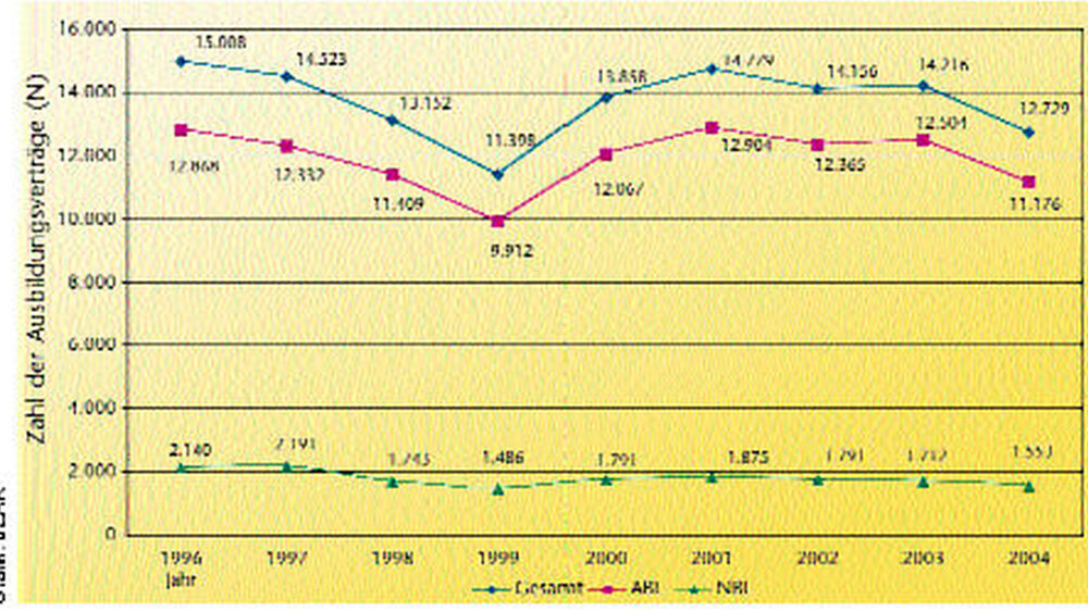 Diese Werte markieren eine deutliche Verringerung der Ausbildungszahlen gegenüber den Vorjahren. Die Zahlen aus den einzelnen Kammerbereichen variieren um den Durchschnittswert. Weitgehend stabile Werte bei den neuen Ausbildungsverhältnissen finden sich lediglich in Brandenburg, Berlin und Hessen.