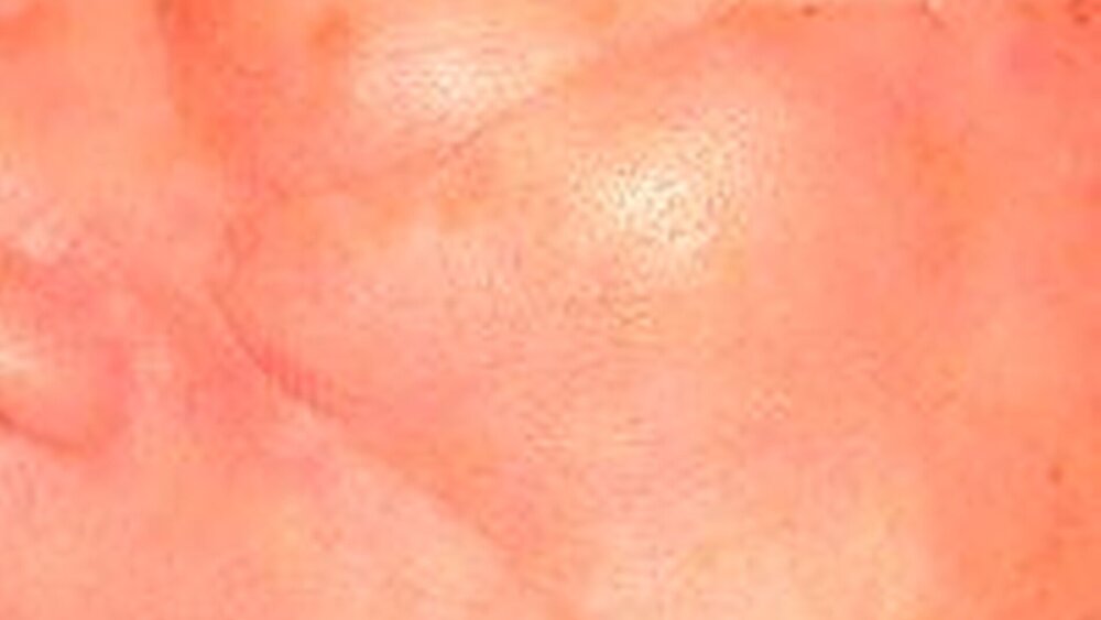 Eine 55-jährige Patientin berichtete über eine umschriebene „Verhärtung” der Haut im Bereich der linken Wange. Hinzu kam ein Juckreiz in der betroffenen Region. Klinisch zeigte sich eine knötchenförmige Hautveränderung mit rötlichem Randsaum im Bereich der Wange (Abb. 1). Die Detailaufnahme zeigt, dass es sich um eine sieben mal sechs Millimeter große, deutlich erhabene, nicht pigmentierte, knötchenförmige Läsion mit oberflächlicher Gefäßzeichnung handelt (Abb. 2).