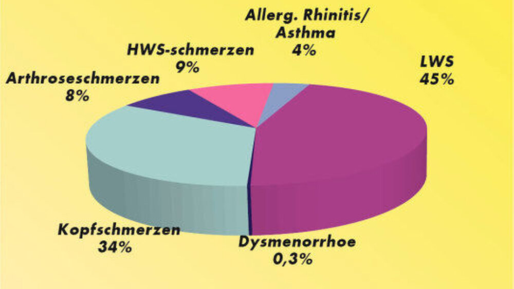 Der Ergebnisse der weltweit größten Akupunktur- Studie, die unter Federführung der Techniker-Krankenkasse durchgeführt wurde, erläuterte Prof. Stefan Willich von der Charité Berlin. Er ist Direktor des Instituts für Sozialmedizin, Epidemiologie und Gesundheitsökonomie. Die Studie wurde prospektiv randomisiert an insgesamt 250 000 Patienten durchgeführt. Sie schloss Patienten mit großen Volksleiden, wie Kopfschmerzen, chronischen Nackenschmerzen oder sogar Heuschnupfen, ein (Übersicht über die Indikationen siehe Abbildung).