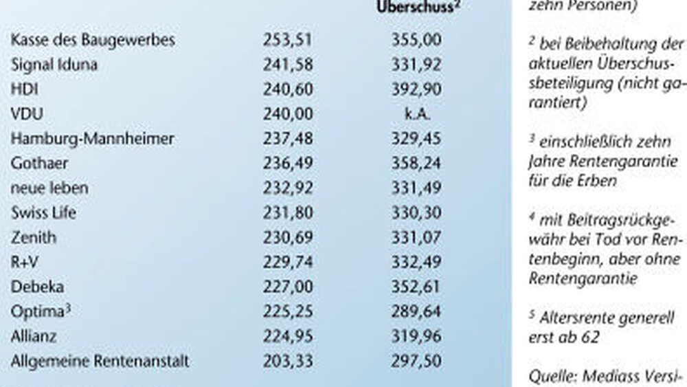 Das Problem bei Pensionskassen: Überwiegend zahlen Pensionskassen dem Vertrieb die Abschlusskosten innerhalb der ersten drei Jahre gut. Mit dieser „Zillmerung“ genannten Kalkulation geht das Guthaben des Arbeitnehmers zunächst stark ins Minus und verzögert die Bildung von Kapital. Folge: Er spart aus eigener Tasche seine Betriebsrente an, stünde jedoch bei einem Firmenwechsel womöglich ohne nennenswerte Betriebsrente da. Vorbildlich aus Arbeitnehmersicht kalkulieren laut Mediass-Umfrage Neue Leben, Kölner Pensionskasse und Swiss Life. Solche Kassen sollten für Praxis-Inhaber erste Wahl sein.