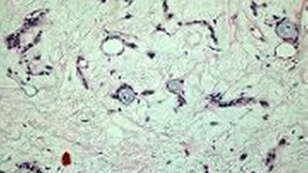 Histologisch ergab sich die abschließende Diagnose eines pleomorphen Adenoms der kleinen Speicheldrüsen. Die Abbildungen 4 a bis c zeigen die histomorphologische Heterogenität eines typischen pleomorphen Adenoms. Drüsenähnliche, tubulär strukturierte Bereiche (Abb. 4a) wechseln mit zellreichen Arealen (Abb. 4b). Daneben finden sich zellarme, stromareiche Bezirke mit vereinzelten drüsenähnlichen Schleim bildenden Zellnestern (Abb. 4c). Die histologischen Bilder entstammen sämtlich dem gleichen Präparat.