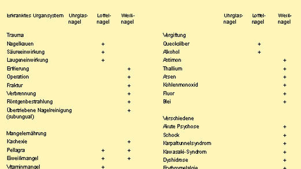 Diese ist durch äußere Einwirkungen auf die Nagelplatte gekennzeichnet, wie beispielsweise bei der superfiziellen Onychomykose. Tabelle 1 gibt eine Übersicht ursächlicher beziehungsweise assoziierter innerer Erkrankungen bei der echten Leukonychie der Nagelplatte.