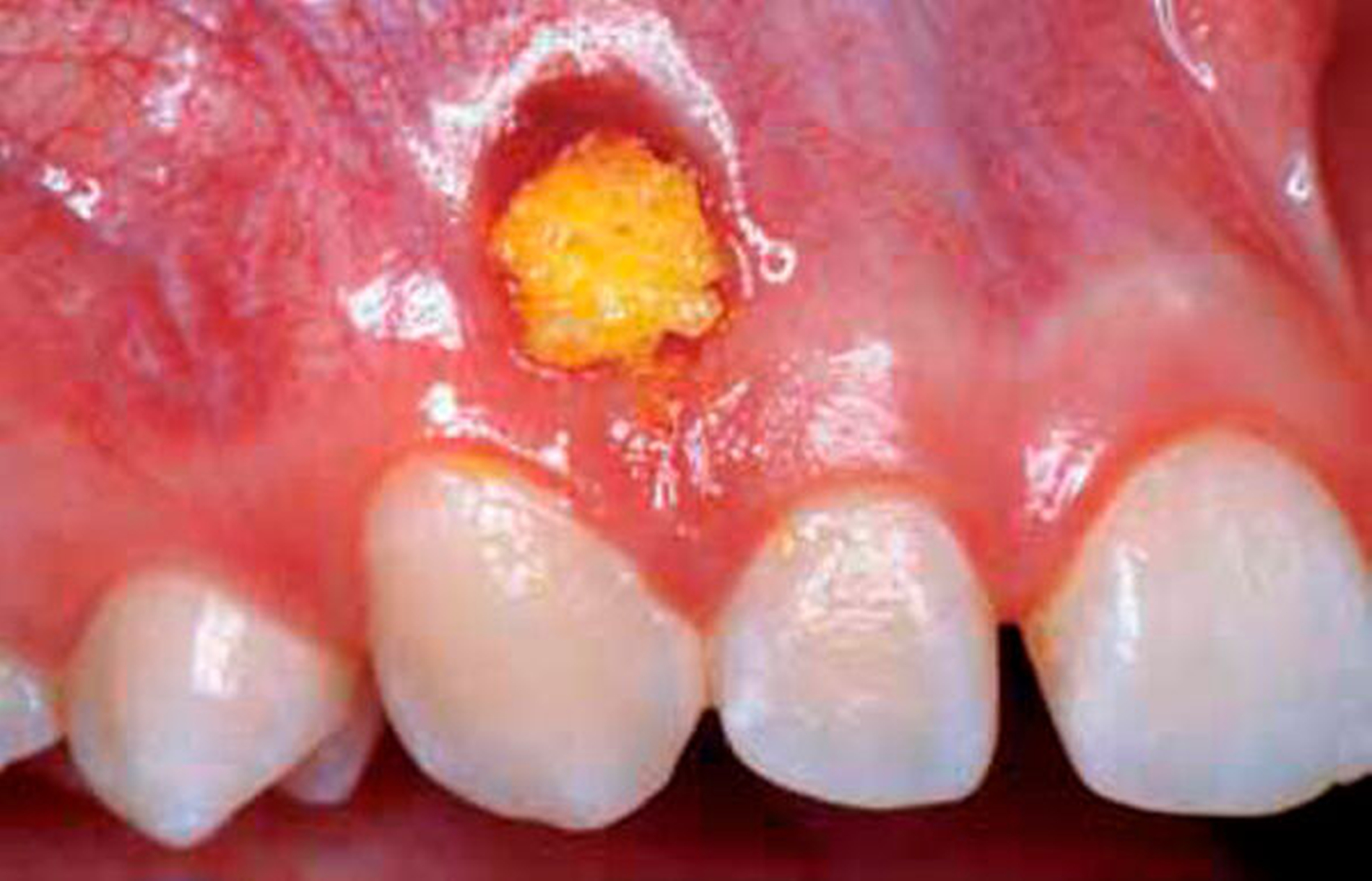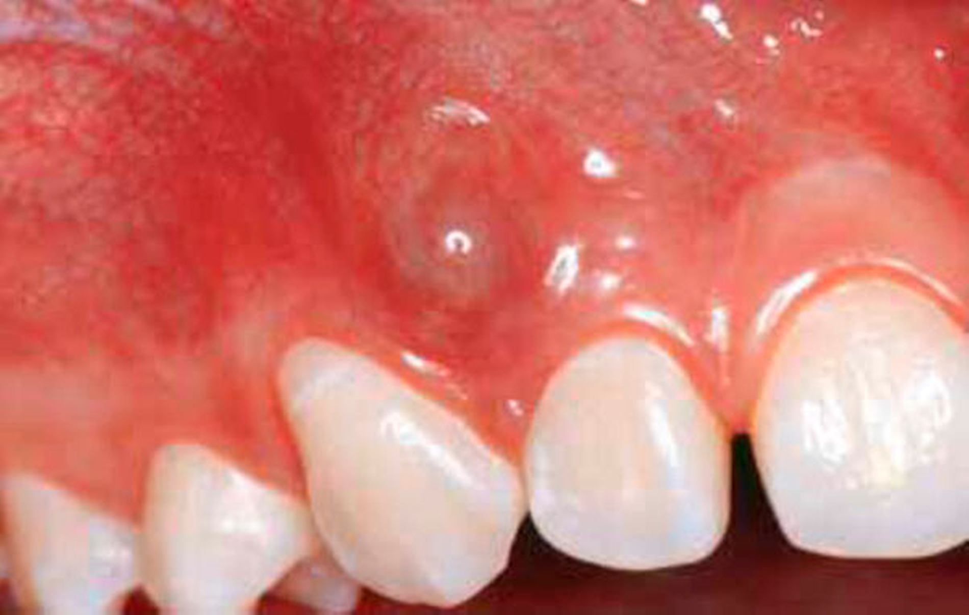 Die GZ wurde auch der parodontalen Zyste gegenübergestellt. Während letztere zwischen den Wurzeln sämtlicher Zähne entstehen kann, erscheint die GZ typischerweise nur zwischen dem lateralen Schneidezahn und dem Eckzahn, dort wo sich Prämaxilla und Maxilla vereinen. Es wurde Wert darauf gelegt, dass die Zyste zwischen parodontal und pulpal gesunden Zähnen vorkommt und somit ein Zweifel an ihrem fissuralen Ursprung ausgeschlossen ist. Die GZ verdrängt die Wurzeln des lateralen Incisivus und des Eckzahns, was als erstes klinisches Zeichen beschrieben wird. Später kann es zu einer Vorwölbung der vestibulären Schleimhaut kommen, oft assoziiert mit einem Druckgefühl (Abb. 1 bis 5).