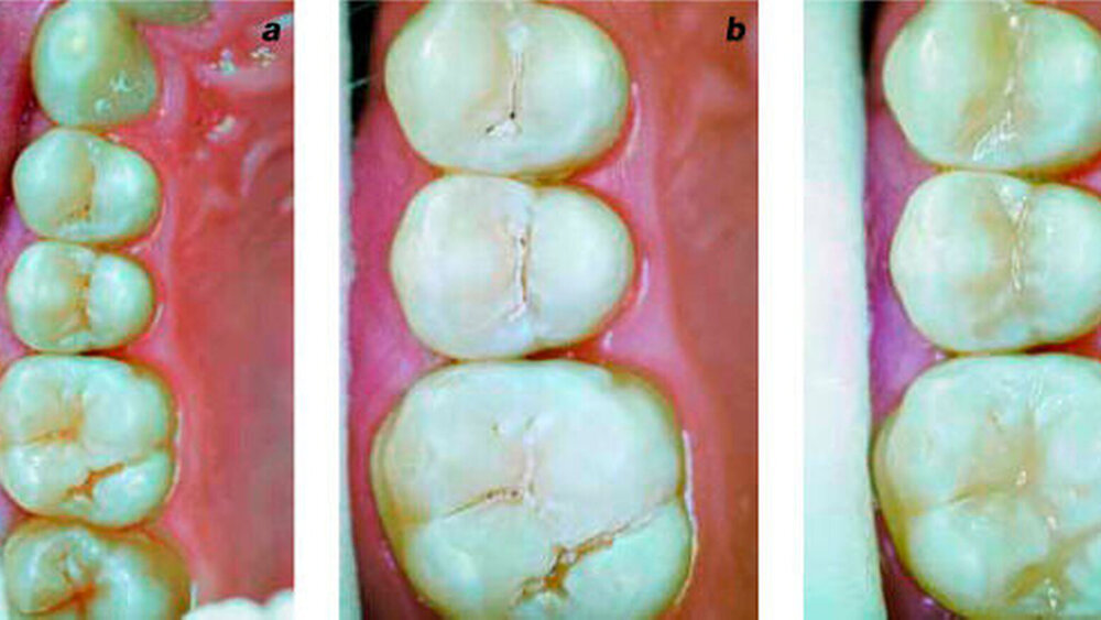 Die klassische Indikation eines Erbiumlasers ist die Therapie primärer kariöser Läsionen. Eine gute Zugänglichkeit und direkte Sicht auf die Kavität erleichtert die Handhabung des Lasers. Aus diesem Grund können die Versorgung von Klasse V Kavitäten und die erweiterte Fissurenversiegelung als Domäne des Lasers bezeichnet werden (Abb. 3 bis 5). Aber auch die Versorgung aller anderen Kavitätenklassen ist grundsätzlich möglich. Dabei ist allerdings zu beachten, dass unterminierende Karies aufgrund des senkrechten Austritts des Lichts aus dem Applikator nur schwierig zu entfernen ist. In diesem Fall muss mehr gesunde Zahnhartsubstanz geopfert werden, was dem minimalinvasiven Anspruch einer Lasertherapie entgegensteht.