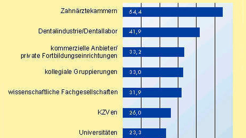 Berufsverbände, Universitäten und KZVen spielen als Fortbildungsträger eine geringere Rolle. Bei den Themenbereichen der Fortbildung im ersten Halbjahr 2004 rangieren Implantologie und Parodontologie mit jeweils über 40 Prozent der Nennungen an ersten Stelle.