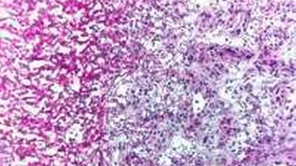 In der Anamnese berichtet der Patient über eine chronisch myeloische Leukämie vor acht Jahren, die sich nach autologer peripherer Blutstammzell-Transplantation in Vollremission befindet. Sieben Monate vor dem aktuellen Ereignis war der Patient an einem klarzelligen Nierenzellkarzinom operiert worden. Vor vier Monaten waren erste Knochenmetastasen im Os sacrum aufgetreten, die mit einer Gesamtdosis von 40 Gy bestrahlt und zusätzlich antiangiogenetisch behandelt wurde. Unter der Verdachtsdiagnose einer Metastase im Unterkiefer erfolgte eine Biopsie des perikoronaren Gewebes, die oberflächlich zunächst lediglich ein entzündliches Infiltrat, in der Tiefe der Läsion schließlich aber den Nachweis einer Metastase des bekannten Nierenzellkarzinoms ergab (Abb. 4).