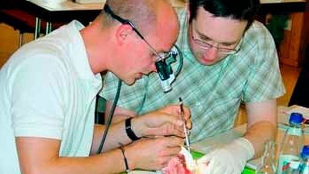 Der theoretische Hintergrund kommt daher in keinem Kursbaustein zu kurz. Zum Beispiel studieren Kursteilnehmer mithilfe einer DVD, die vom (niedergelassenen) Kursleiter eigens produziert wurde, schon im Vorfeld des Seefelder Einsteigerkurses anatomisches Grundlagenwissen. Umgekehrt kommt auch in der Uniklinik die Praxis zu ihrem Recht: So werden in Erlangen am Freitagnachmittag für zwei Stunden Nervlateralisierungen und andere chirurgische Techniken am Schweinekiefer geübt.