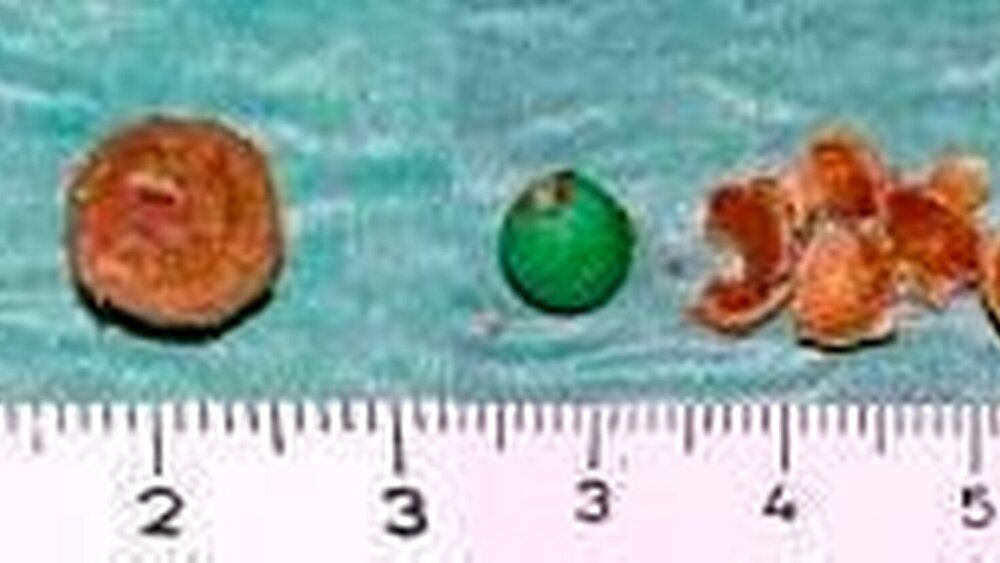 Da die Compliance des Patienten eine Exploration der Nase nicht erlaubte, wurde die Nase in einer kurzen Narkose inspiziert. Hierbei fand sich im unteren rechten Nasengang ein grau-braun imponierender Fremdkörper (Abb. 4). Das Objekt wurde mit einer Häkchensonde entnommen. Mit leichtem Druck ließ sich die harte Kalkschale des Fremdkörpers aufsprengen. Letztlich ergab sich als primärer Fremdkörper eine etwa acht Millimeter durchmessende lackierte Holzperle.