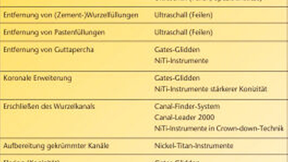 Neben den „klassischen“, auf dem Einsatz unterschiedlichster Feilensysteme und Techniken basierenden Wurzelkanalaufbereitungstechniken wird die Anwendung weiterer Technologien und Instrumente diskutiert. Hierzu gehören: