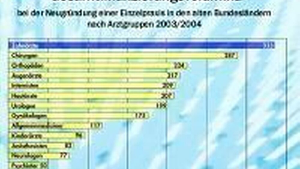 Im Jahr 2004 entfielen 65 Prozent des Finanzierungsvolumens einer Einzelpraxisneugründung auf die medizinisch-technischen Geräte und Einrichtung, 14 Prozent auf die Bau- und Umbaukosten und 21 Prozent auf den Betriebsmittelkredit. Bei einer Einzelpraxisübernahme wurden im Jahr 2004 durchschnittlich 43 Prozent des Finanzierungsvolumens für den Substanzwert zuzüglich Neuanschaffungen, 32 Prozent für den Goodwill, vier Prozent für die Bau- und Umbaukosten und 21 Prozent für den Betriebsmittelkredit aufgewendet. Im langfristigen Trend hat sich die Kostenverteilung damit als relativ stabil erwiesen.