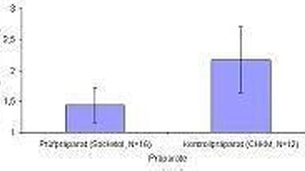 Die Unterschiede beim Handling stellten sich als statistisch signifikant heraus. Bei einer Bewertung nach dem deutschen Schulnotensystem (1 bis 6) betrug die Benotung für die Anwendung von Socketol 1,44 und für CHKM-Gazestreifen 2,17 (p = 0,009, t-Test) (siehe Abb. 5).