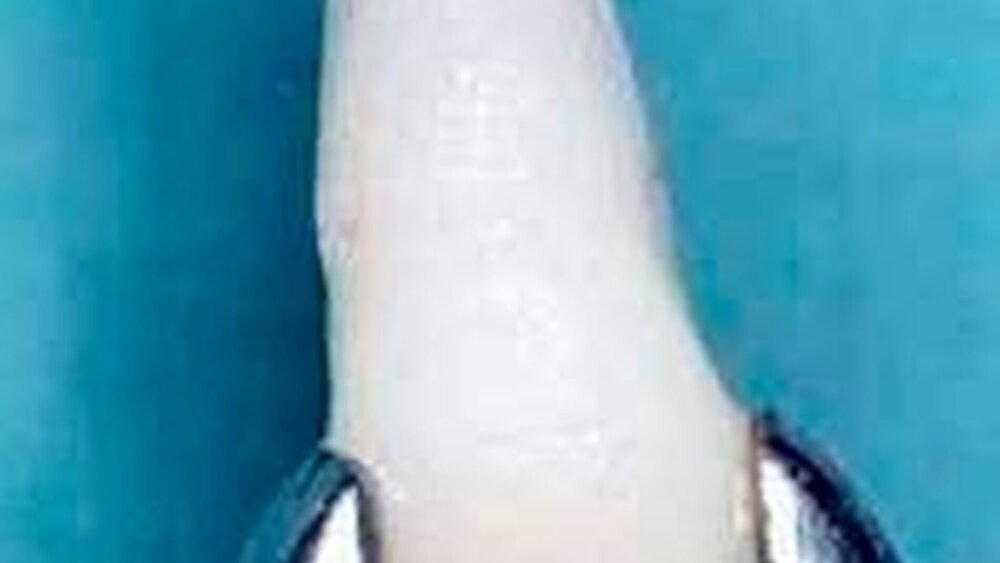Falls eine endodontische Therapie indiziert ist, soll diese innerhalb von sieben bis zehn Tagen erfolgen. Alternativ kann eine sofortige extraorale Wurzelkanalbehandlung von retrograd mit Hilfe von Titanstiften deutlich schneller und effektiver durchgeführt werden (RetroPost®, Fa. Brasseler-Komet, Lemgo) (Abbildung 4). Auch dieses Verfahren ist in der aktuellen Literatur detailliert beschrieben [Kirschner et al., 2002].