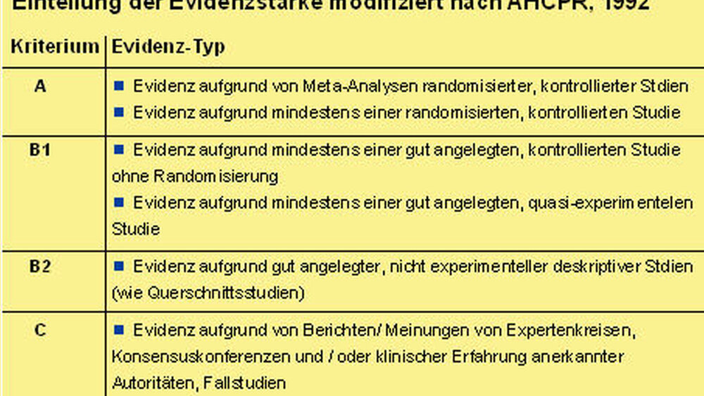 Tabelle 1: Definitionen zur Evidenzstärke. Bei der Bewertung der Evidenzstärke wurden die von der Arbeitsgemeinschaft der Wissenschaftlichen Medizinischen Fachgesellschaften (AWMF) modifizierten Definitionen der Agency for Health Care Policy and Research 1992 zugrunde gelegt [Arbeitsgemeinschaften der wissenschaftlichen medizinischen Fachgesellschaften (AWMF): Das Leitlinien-Manual. Düsseldorf: AWMF, 2000].