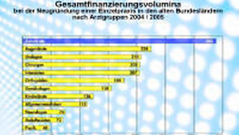 Im Jahr 2005 entfielen 66 Prozent des Finanzierungsvolumens einer Einzelpraxisneugründung auf die medizinisch-technischen Geräte und Einrichtung, 11 Prozent auf die Bau- und Umbaukosten und 23 Prozent auf den Betriebsmittelkredit.