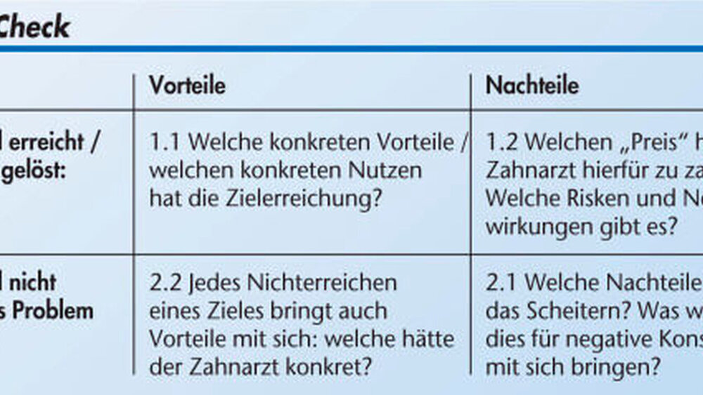 • es zwar verstanden haben und dem Zahnarzt vertrauen, aber nicht mitgehen, etwa weil sie keine positiven Veränderungen erwarten und / oder „der Preis für die Veränderung zu hoch“ ist. Typisches Beispiel: Patienten, die trotz klarer Vereinbarung bei versäumten Terminen das Ausfallhonorar verweigern und „mit Weggang in eine andere Praxis“ drohen. Oder der Chef setzt für auszubauende Prophylaxe als Ziel 55 000 Euro im Jahr, doch das Team orientiert sich bei der Zahlungskraft der Patienten an Negativbeispielen oder am eigenen Unwillen zu Zuzahlungen. Konflikte sind immer als Widerstände zu spüren, primär emotionaler Art. Selten folgen auf klare Fragen klare Antworten, manchmal kommt den Betroffenen eher „etwas nicht geheuer“ vor, weil die Signale verschlüsselt sind: