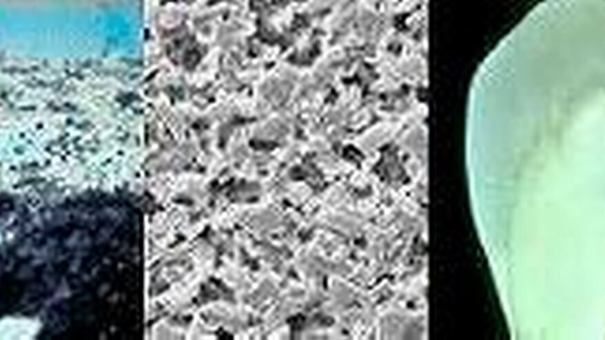 Fabrikgefertigte Blockkeramiken erzielen generell eine höhere Qualität als laborgefertigte Keramiken der gleichen Art [Kelly]. Im Labor gebrannte Keramiken haben sich nicht bewährt [Kelly]. Keine der bekannten Verblendkeramiken erreicht die Qualität der Mark II Blockkeramik [Kelly]. Die Blockkeramiken Mark II (Vita), ProCAD (Ivoclar Vivadent) und von 3M-Espe werden als ästhetische, hoch glashaltige Keramiken, aus feldspathischen oder synthetischen Aluminosilikatgläsern als Matrix, mit unterschiedlichen, hoch schmelzenden Glasfüllerzusätzen (Nephelin, Albit beziehungsweise Leuzit), charakterisiert [Kelly] (Abbildung 1). Im Gegensatz dazu haben die Strukturkeramiken einen niedrigen Glasanteil als Matrix (Lithiumdisilikat) oder als Infiltrat (Lanthanglas) bei klassischem In- Ceram (Gerüstkeramik) beziehungsweise überhaupt keinen Glasgehalt bei polykristalliner Aluminiumoxid- und Zirkonoxidkeramik (Oxid-Gerüstkeramiken). Die Festigkeit der mit CEREC maschinell bearbeiteten ästhetischen Keramiken ist mindestens so hoch wie die von Presskeramik [Kelly]. CEREC Blockkeramiken repräsentieren die höchste Qualitätsstufe in jeder Mikrostrukturkategorie [Kelly]. Sie sind zahnschmelzähnlich in ihrem Aussehen (Transluzenz), in ihrer Beständigkeit, und sie bieten durch ihre Ätzbarkeit gute Voraussetzungen für die adhäsive Befestigung. Als Restauration gewinnen diese Keramiken ihre klinische dauerhafte Qualität durch die adhäsive Befestigung an der Zahnhartsubstanz, und zwar durch Adhäsion am Schmelz und am Dentin.