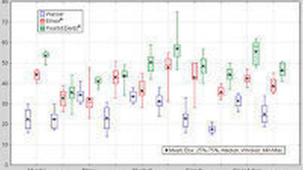 Die Abbildungen 8 und 9 zeigen Boxplot-Diagramme, mit denen die Ergebnisse aller zehn Zahnbürsten mit einem Putzmedium (Wasser und Zahnpasten) in je einem Boxplot dargestellt sind. Die Prozentile wurden bei 25 Prozent und 75 Prozent gewählt. Der mittlere Querstrich kennzeichnet den Medianwert, das Kreuz den Mittelwert.