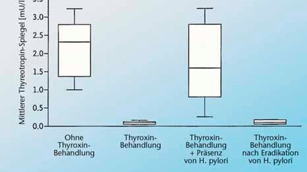 Gemessen wurde, welche Thyroxin-Dosis je nach Magenbefund bei diesen Patienten benötigt wurde, um auf den angestrebten Thyreotropin-Spiegel einstellen zu können. Es zeigte sich, dass bei Patienten mit Gastritis beziehungsweise mit H. pylori-Besiedelung die Thyroxin-Dosis, welche für die Erzielung der angestrebten Thyreotropin-Spiegel benötigt wurde, um 22 bis 34 Prozent höher war als bei Patienten, die über eine normale Magenazidität verfügten (p = 0,002). Im Umkehrschluss war nach der Eradikation von H. pylori, in deren Folge sich eine normale Azidität einstellt, eine wesentlich geringere Thyroxin-Dosis erforderlich beziehungsweise der Effekt einer konstanten Dosis verstärkt, wie die Abbildung verdeutlicht.