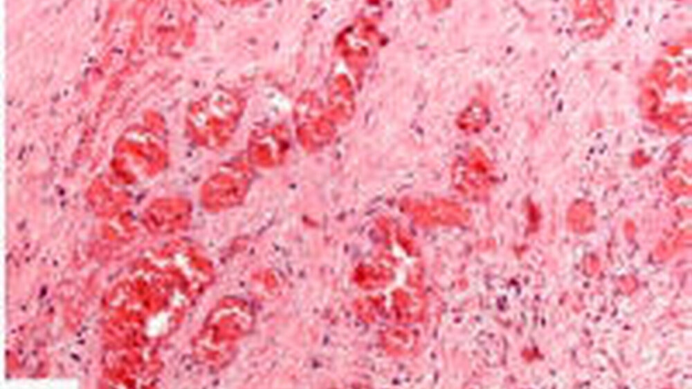 Die für eine Gefäßmalformation ungewöhnliche Festigkeit des Befundes, die ja schließlich zur klinischen Wahrnehmung führte, ist möglicherweise auf eine partielle Thrombosierung und einen nachfolgenden sekundären fibrotischen Umbau zurückzuführen. Zumindest waren die Gefäßformationen in Teilen des Tumors von einer breiten fibrösen Gewebezone umgeben (Abbildung 6 d).